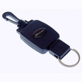 A compact retractable line with a rust free split ring and swivel attachment clip. Extends to around 45 cm when fully deployed.