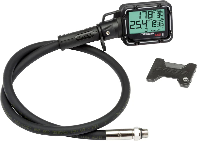 The Cressi Digi 2 Console is extremely precise, compact alternative to traditional analog consoles. It displays all your essential information depth, remaining air, and temperature in a neat little package. Plus it calculates your remaining air to within 1 bar accuracy and your remaining dive time to 50bars.