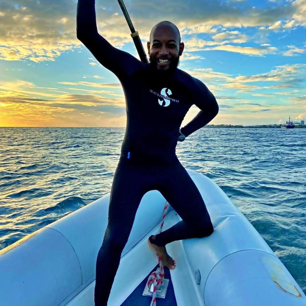 Man on a boat wearing a wetsuit